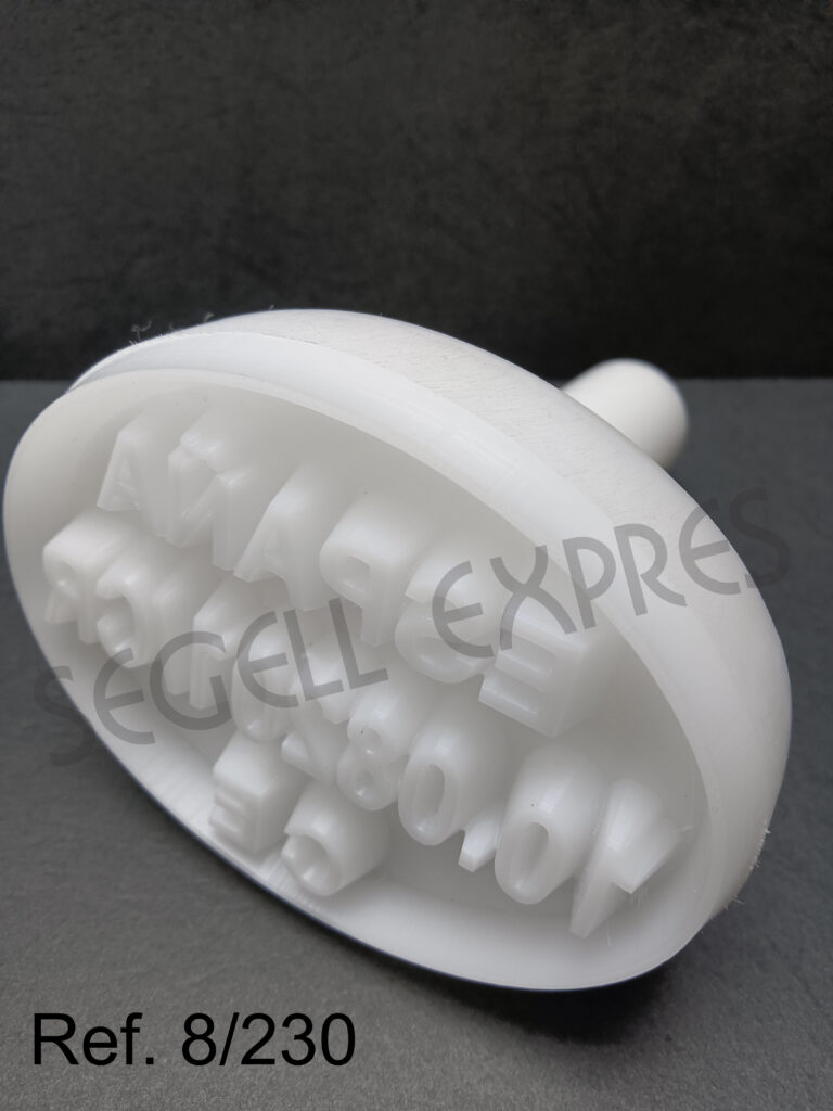 sello fabricado en nylon, con aptitud alimentaria, para marcar con tinta sobre la carne, empanadillas, hamburguesas… Se puede grabar y mecanizar según la necesidad del cliente.